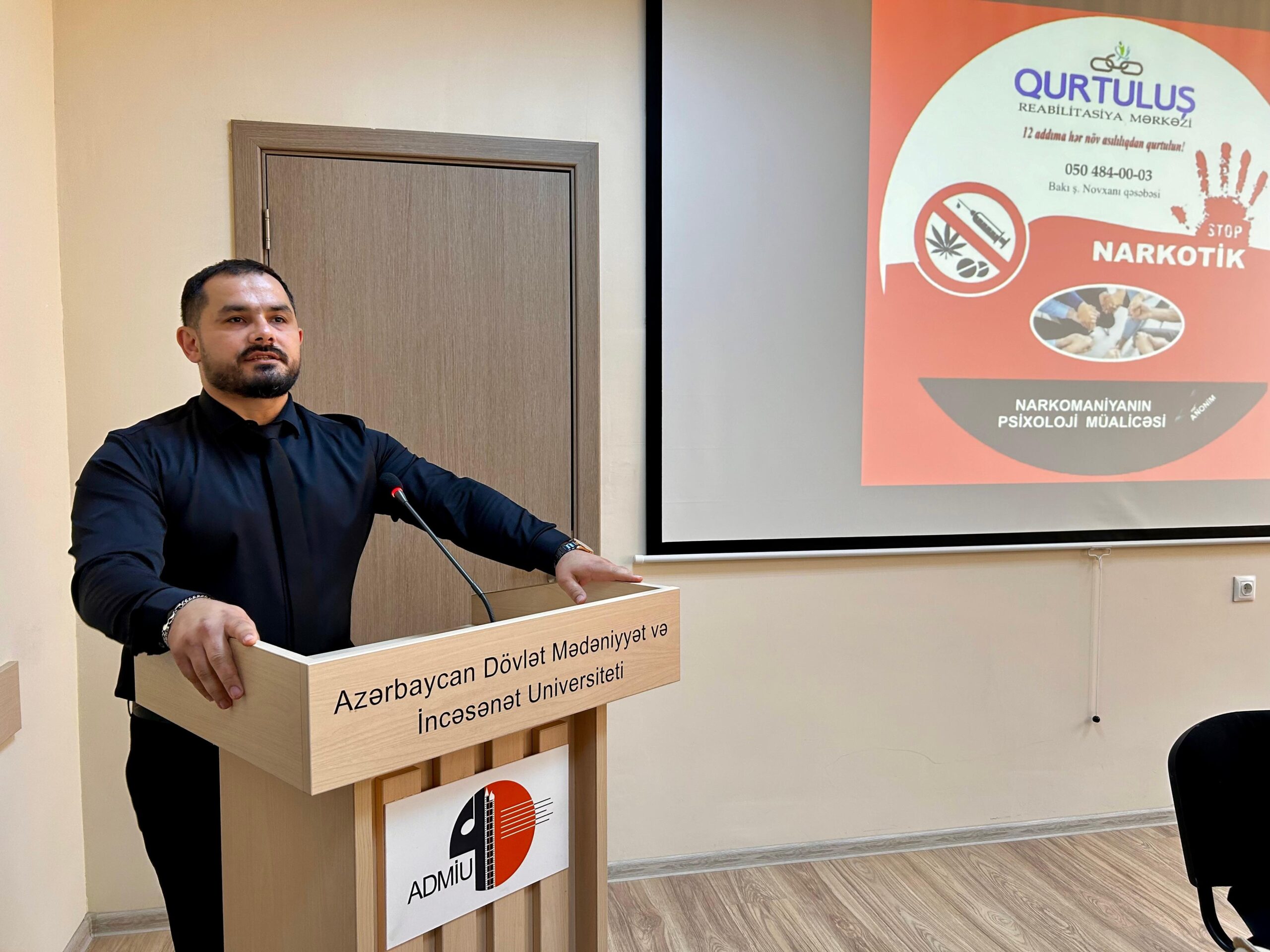 Oktyabrın 8-də Azərbaycan Dövlət Mədəniyyət və İncəsənət Universitetində (ADMİU) Tələbə Elmi-Yaradıcılıq Cəmiyyətinin təşkilatçılığı ilə universitetin Rəssamlıq fakültəsinin tələbələri üçün narkomaniya əleyhinə maarifləndirici tədbir keçirilib. Tədbiri giriş nitqi ilə ADMİU-nun Elm və Yaradıcılıq işləri üzrə prorektoru Sədaqət Əliyeva açaraq dövrümüzün bəlası olan narkomaniya və digər asılılıqlardan danışıb, onların gətirdiyi fəsadları vurğulayıb.