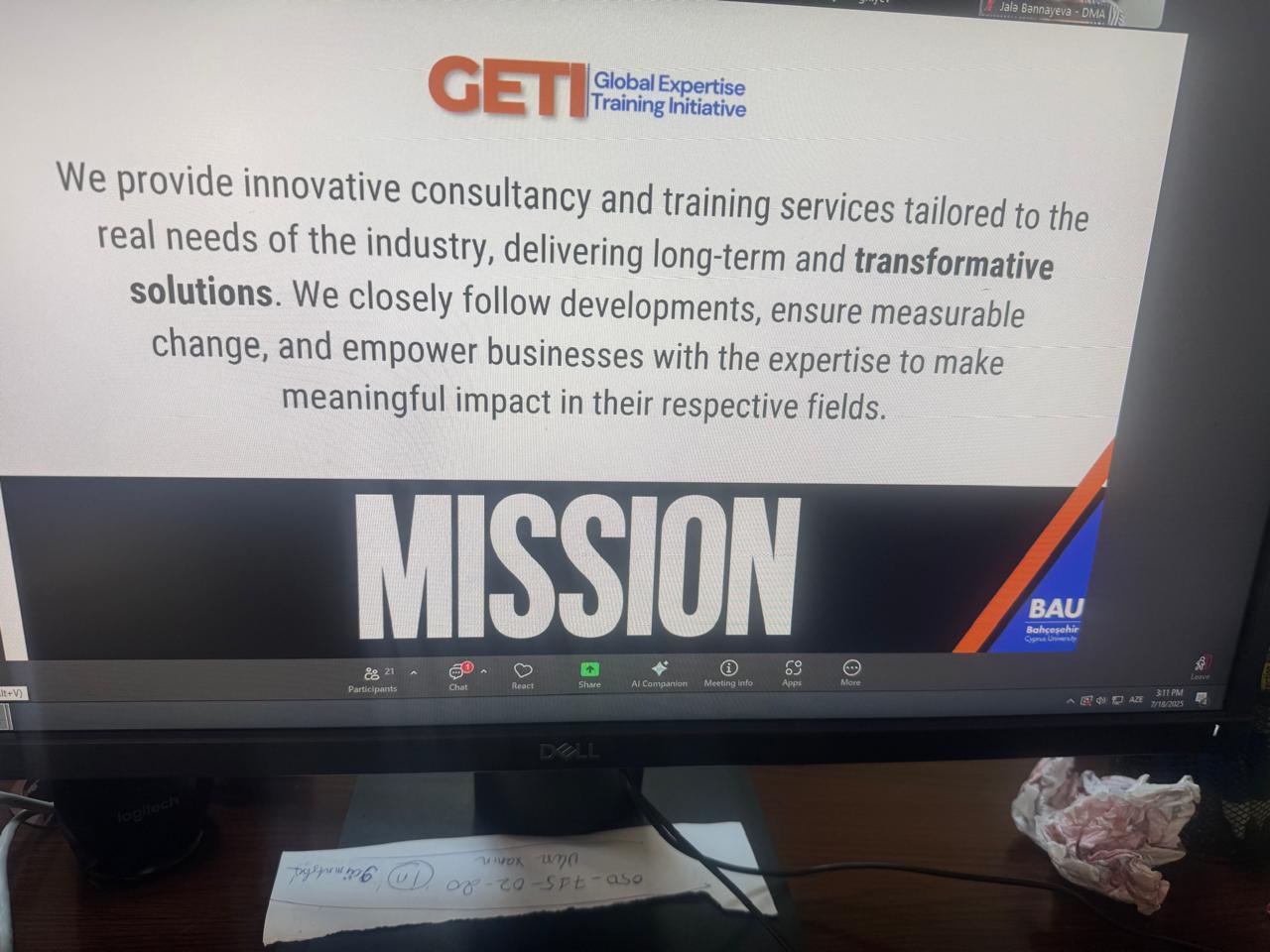 Dövlət Məşğulluq Agentliyi (DMA) və ali təhsil müəssisələri arasında əməkdaşlıq davam edir. DMA Mərkəzi Karyera filialı tərəfindən təşkil olunan “Təcrübə danışır” layihəsi çərçivəsində 18 iyul 2025-ci il tarixində Bahçeşehir Universitetinin Kiprdəki filialının beynəlxalq şöbəsinin müdiri Nuket Tanol və Universitetin “GETİ” təşəbbüsünün koordinatoru Vildan Esenyel tələbə və məzunlara dair karyera ilə bağlı təcrübələrini bölüşüb. İclasda məzunların karyeralarının izlənməsi mexanizmləri müzakirə olunub. Jalə Bənnayevanın moderatorluğu ilə keçirilən görüşdə ADMİU-nun Tədris işləri üzrə prorektoru dosent Nigar Rüstəmova və Tədris şöbəsinin müdiri Namiq Qafarov iştirak edib. Azərbaycan Dövlət Mədəniyyət və İncəsənət Universitetinin tələbə və məzunların karyerası ilə bağlı təcrübəsini iclas iştirakçıları ilə bölüşüblər.